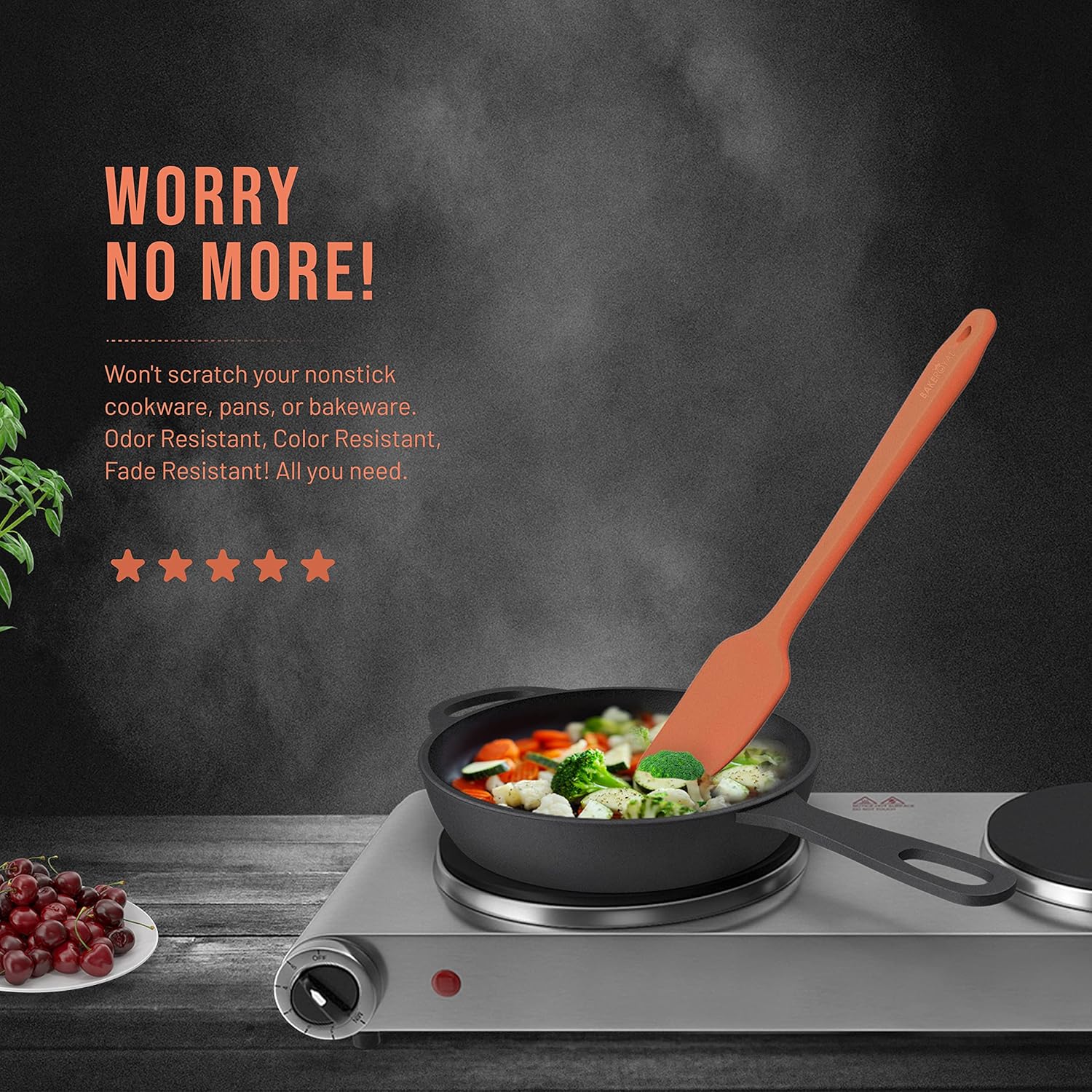 - CAREFULLY CRAFTED with CONSIDERED MATERIALS: One of the best things about Bake Royal silicon spatula kitchen utensils is its ability to withstand heat safely, each spatula is heat-resistant up to whopping 600 degrees Fahrenheit and won’t melt (even leave it in the pot for a while) or impart anything to food even at those extreme temperatures. Exposure to such heat can permanently damage low grade rubber spatulas or plastic spatula but our spatula head won't even become knicked or warped.