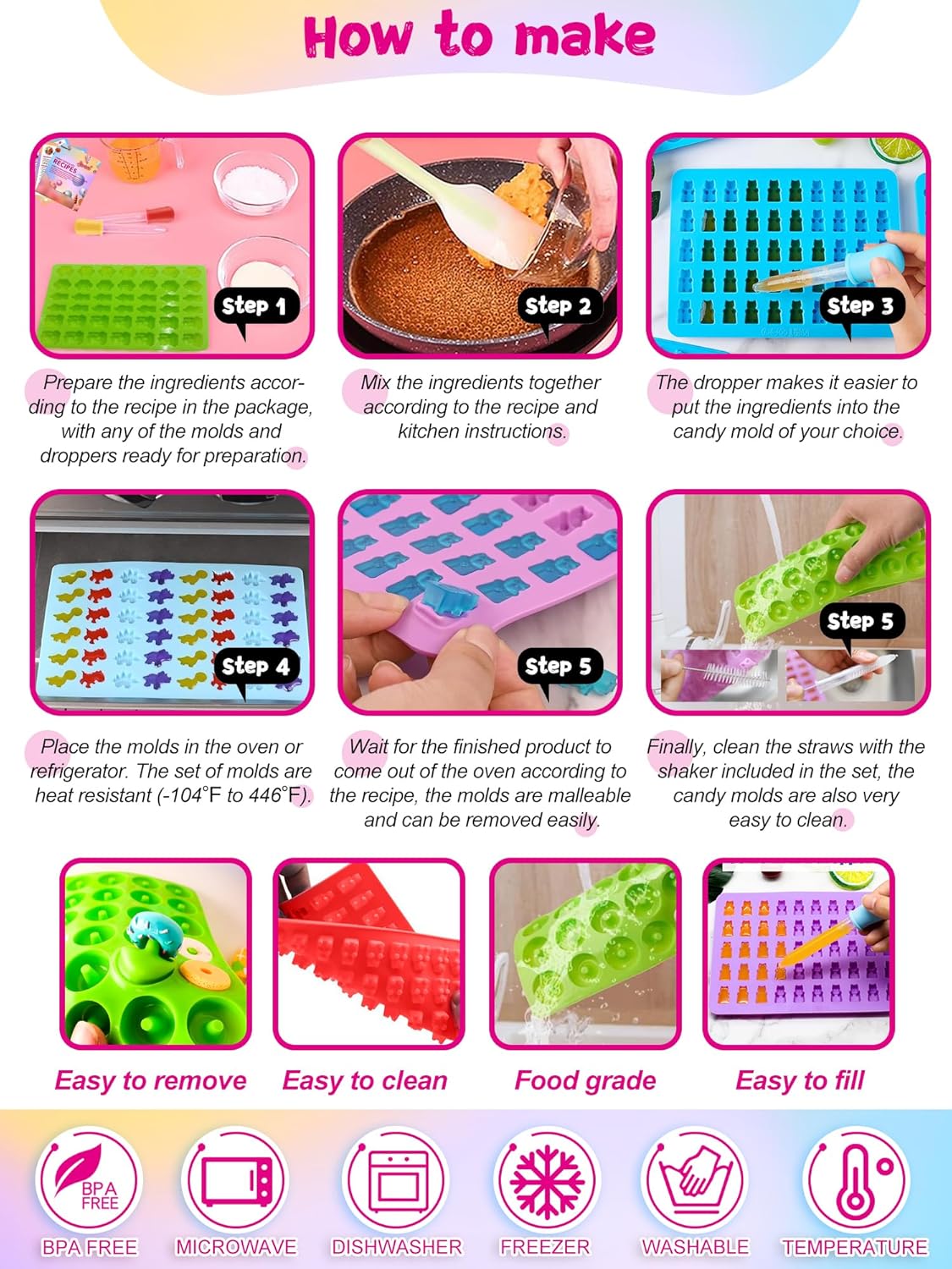 117Pcs Silicone Gummy Bear Molds Kit with 100 Wrappers, 5 Recipe Cards, 4 Droppers & 2 Brushes,Non-Stick Candy Mold for DIY Chocolate, Gummy Bears, Party Favors (Dinosaur, Bear, Fruits, Donut Shapes)