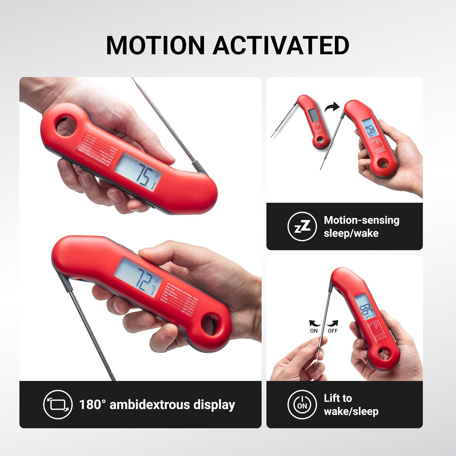 - USER-FRIENDLY DESIGN - The auto-rotating display of the food thermometer ensures seamless usability for both right and left-handed chefs; The ambidextrous intelligent backlight allows flawless reading in the dark; The smart sleep function helps extend battery life; The built-in bottle opener makes the ThermoMaven not just a digital meat thermometer, but a practical companion for your BBQ and outdoor gatherings!