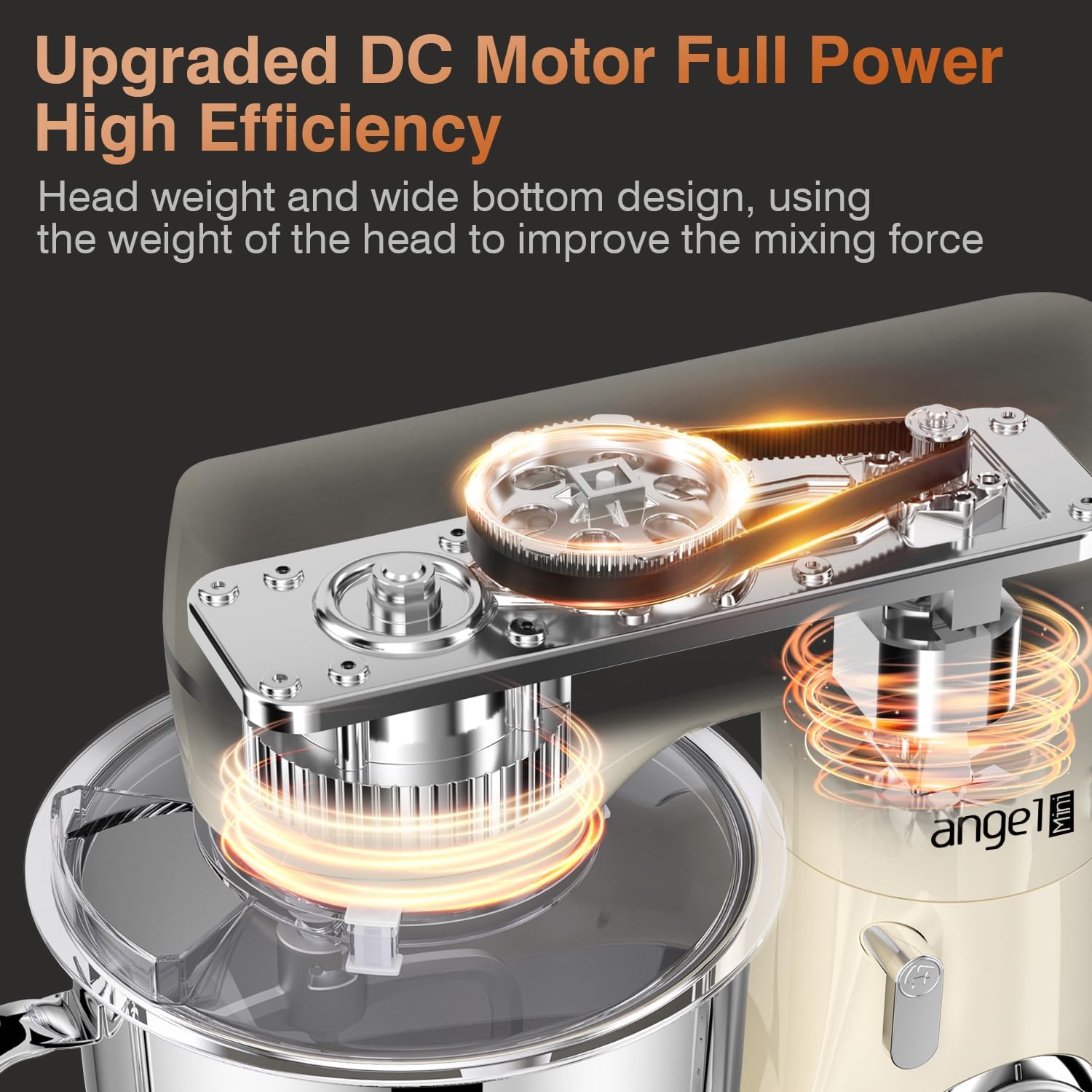 - ăUpgrated DC Motor System ăMini Angel stand mixers adopt all metal gear structure, with closed gearbox, effectively reduce the sound, speed running stable without stalling with can long service life. And the planetary mixing system which functions more touch points per rotation during mixing process, so that all the mix is stirred at a full extent.