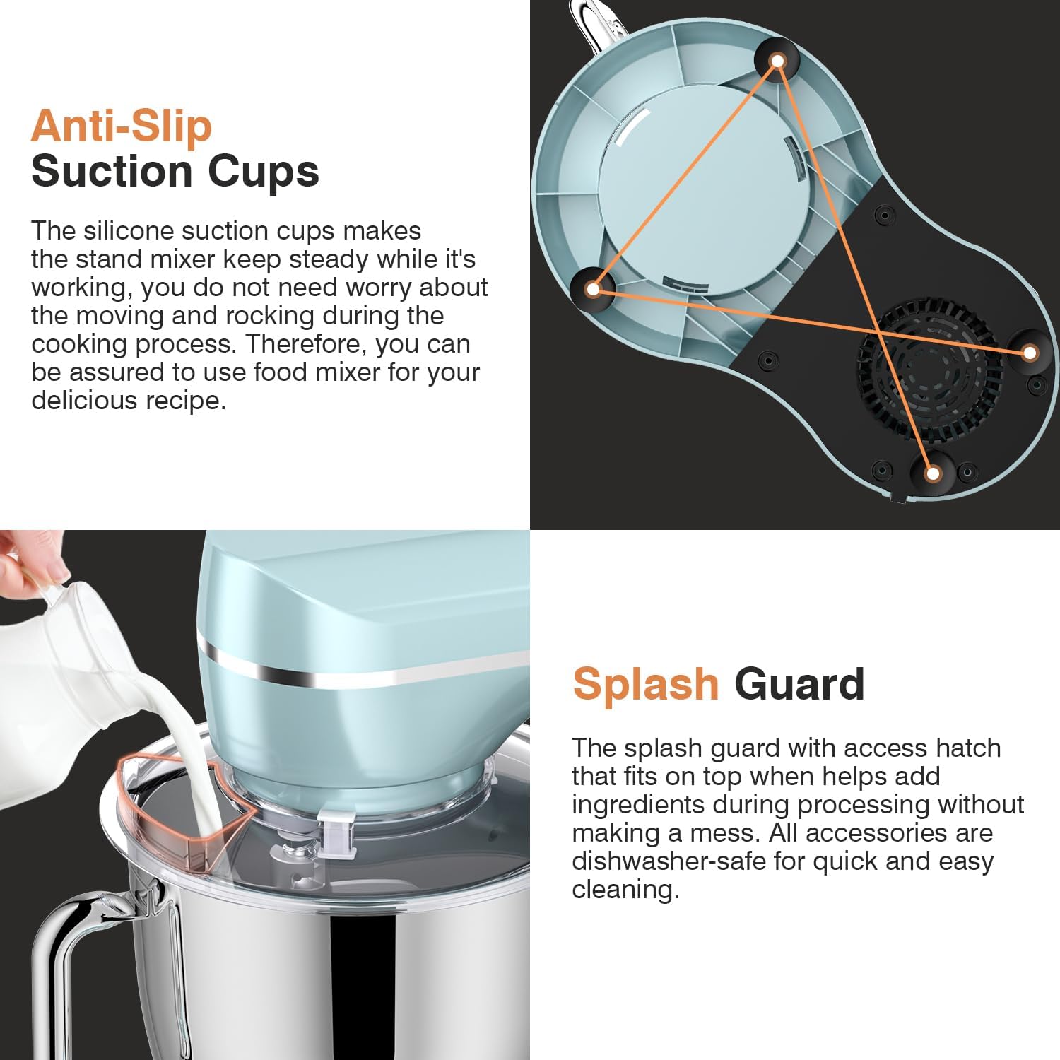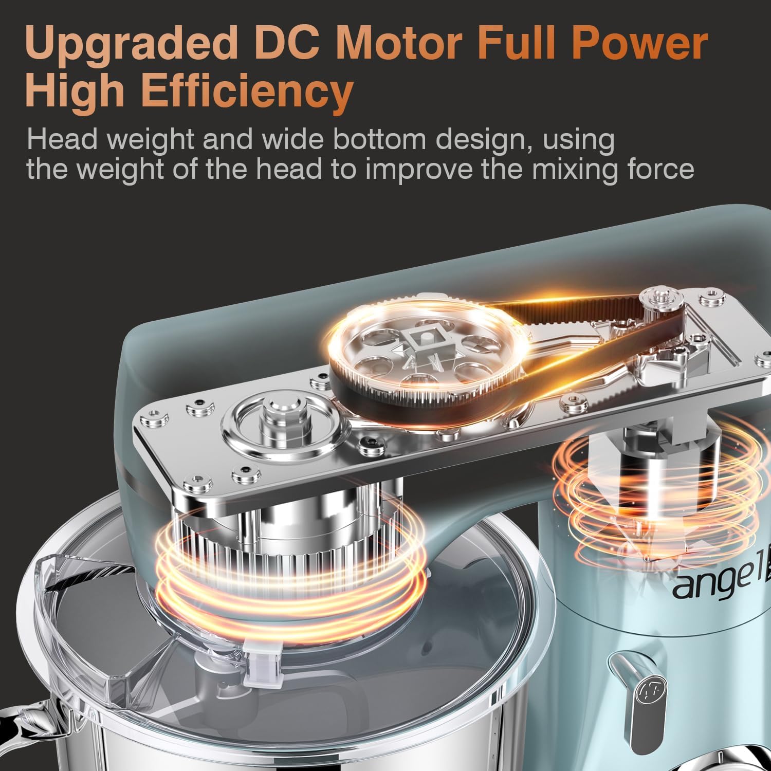 - ăUpgrated DC Motor System ăMini Angel stand mixers adopt all metal gear structure, with closed gearbox, effectively reduce the sound, speed running stable without stalling with can long service life. And the planetary mixing system which functions more touch points per rotation during mixing process, so that all the mix is stirred at a full extent.