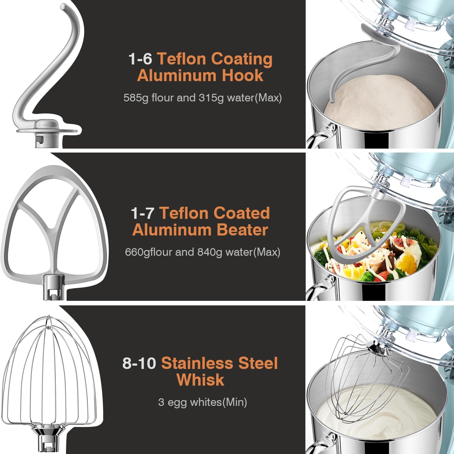 - ă3+1 Attachments, Easy to CleanăCompared with chef machines of the same type, our dough hooks and mixing beater cleanups quickly with a safe, non-stick coating that leaves no trace elements in your food. And it will not turn black after repeated use. For the whisk, wash it with your hand. Besides, the scraper helps you easy to take out the food and clean the bowl.