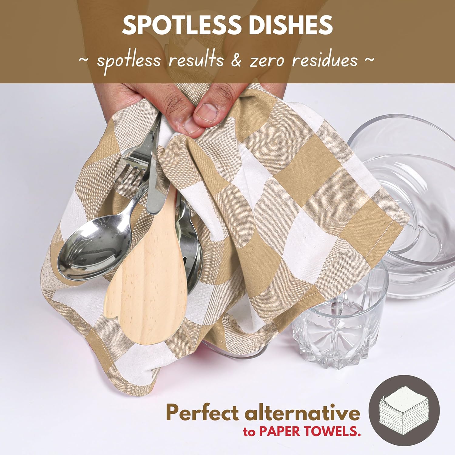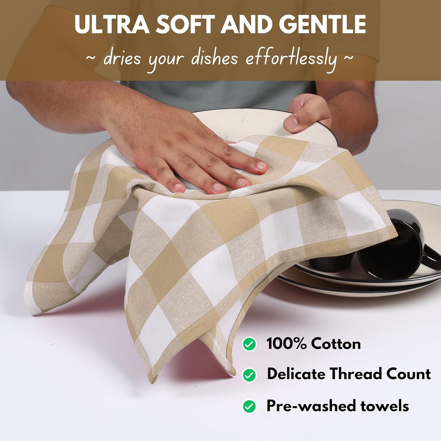 Native Fab 12 Pack Buffalo Check Kitchen Towel 16"x26" - Cotton Dish Towels Washable - Absorbent Tea Towels, Soft Hand Towel with Hanging Loop, Dish Cloth Set - Beige White